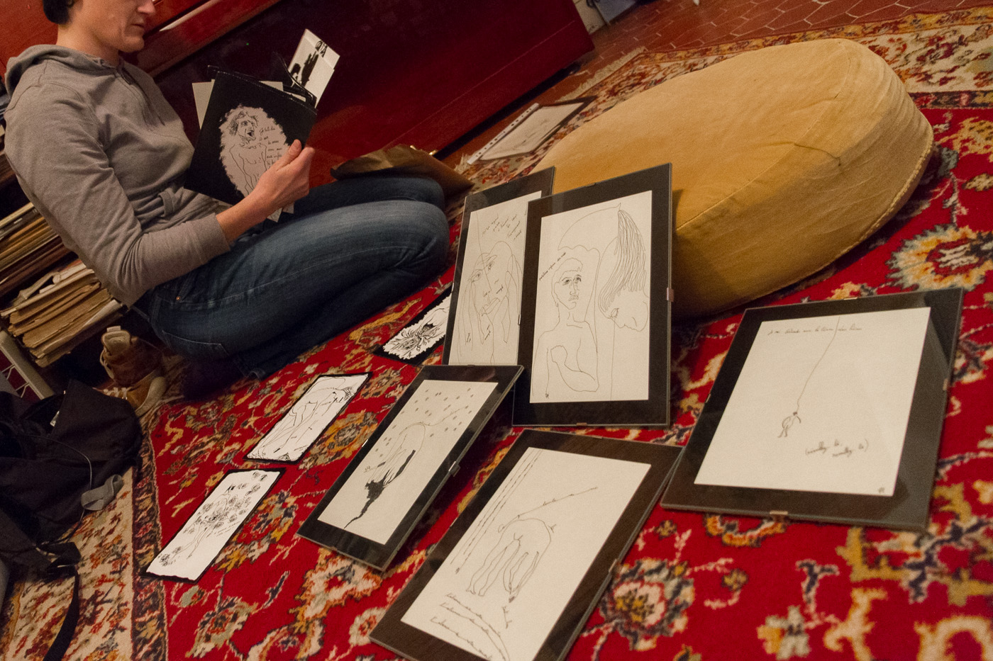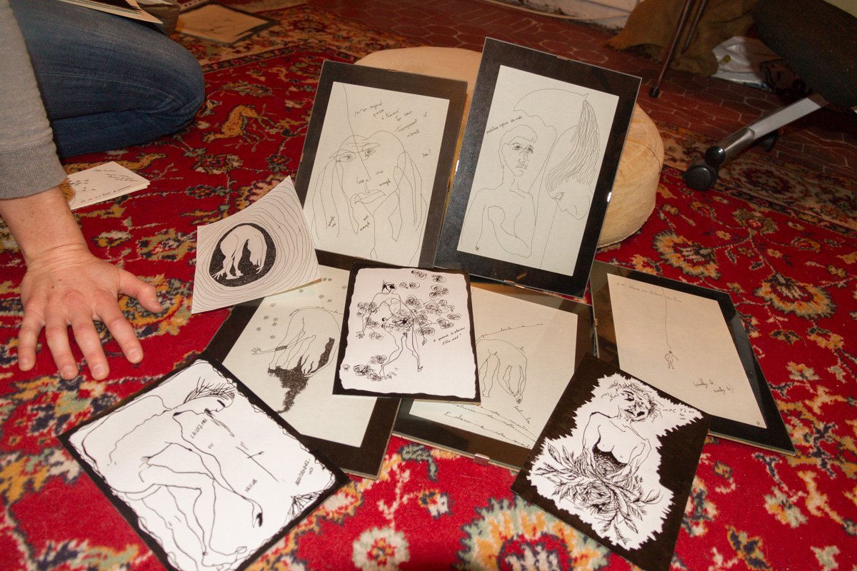 Je ne dessine presque plus depuis que j’ai appris ma douance. Ces dessins sont comme des outils que je m’étais donné et que je n’ai jamais réussi à lire. Avant, quand je revenais des séances de dessin, je les affichais, j’en tapissais mes murs. Je les décrochais quand le dessin arrêtait de me parler. Finalement je me suis parlé pendant des années sans jamais entendre ce que je me disais. Il y a quelques mois, au printemps, j’ai tout enlevé. J’en avais assez de cette auto agressivité.